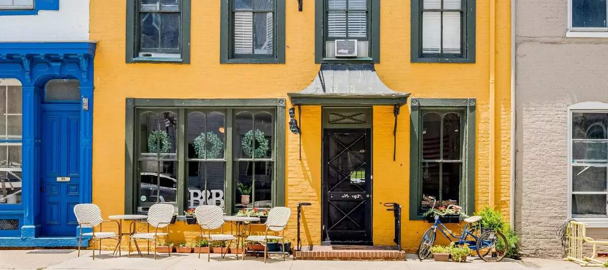 Front facade of a business with yellow brick, large windows and patio tables and chairs out front